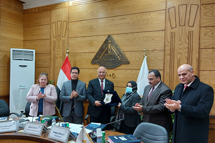Benha University Board under presidency of Prof.Dr.Gamal Sosa, Benha University President has honored Dr.Hoida Sadeq , the Faculty of Nursing dean after ending her period as a dean for faculty of Nursing. The meeting was held in presence of Prof. Tamer Samir, Benha University Vice-president for Education and Students 'Affairs, Prof. Dr. Nasser El Gizawy, Benha University Vice President for Post graduate Studies and Scientific Research and Dr.Mahmoud Maghraby ,the general supervisor on Community Service and Environment Affairs, Mrs. Shereen Shawqy and other members of the board. On the other hand, Prof.Dr.Gamal Sosa has thanked Dr. Hoida Sadeq for her great efforts during her deanship which includes obtaining the academic accreditation in 2014 from the National Authority for Quality Assurance and Accreditation of Education which renewed last October2021. Benha University Board hoped for her best wishes.